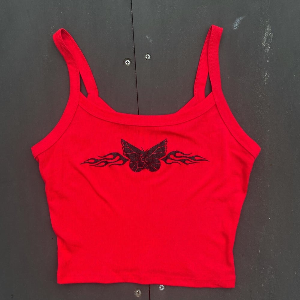 The “Butterfly Grip Flames” fire red, micro rib spagetti strapped tank. Cropped fit, great for pairing with your favorite skate pants and hitting the local spots or going on a road trip.