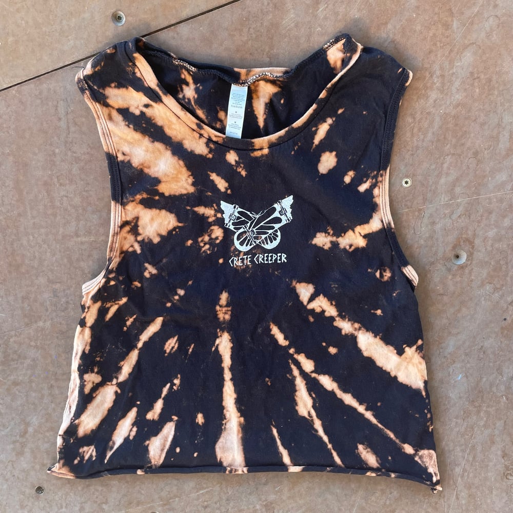 Two-toned spiral pattern on a racerback, cropped tank with the “Butterfly Board” graphic in white. This lightweight tank has low cut armholes to help keep you cool and comfortable during the most heated of sessions.